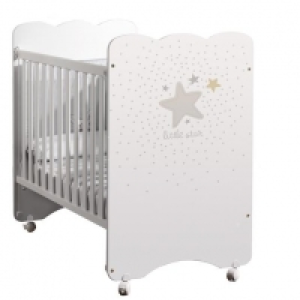 Micuna - Cuna New Little Star , una cuna con serigrafía en cabecero y piecero a juego con la bañera New Little Star. Material: haya y MDF. Con 3 posiciones de somier, 4 ruedas (2 con freno), 1 lateral móvil y 1 lateral fijo. Dimensiones: Alto: 100,2 cm Ancho: 65,5 cm Profundo: 120,2 cm